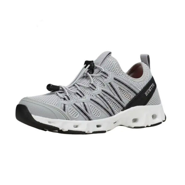 کفش پیاده روی HUMTTO مدل 610049A مناسب برای پیاده روی و کوهپیمایی در فصل بهار و تابستان می باشد. شما با این کفش میتوانید پیاده روی راحتی را در مسیر دره و داخل رودخانه داشته باشید. کفی این کفش لژدار بوده که نرم و اسفنجی می باشد . همچنین قسمت کف کفش دارای عاج می باشد که مانع از لغزش و سر خوردن شما می شود. لایه رویی کفش دارای منفذ است که باعث گردش هوا و جلوگیری ازعرق کردن پا میشود و همچنین در مسیرهای رودخانه آب به سرعت از کفش شما خارج می شود. کفی این کفش به گونه ای مشبک طراحی شده تا در صورت ورود آب، تخلیه آن سریع انجام شود. دورتادور کفش نیز سوراخ هایی جهت تخلیه سریع آب درون کفش قرار دارد.
