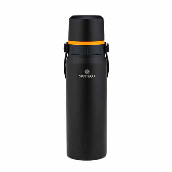 برای کسانی که دائماً در حال سفر، طبیعت گردی، کوهنوردی و ... هستند داشتن یک فلاسک برای حمل نوشیدنی گرم وسرد ضروری است. کمپانی قدرتمند SANTECO با طراحی و تولید انواع فلاسک با تنوع رنگی گوناگون توانسته است توجه طیف گسترده ای را به خود جلب نماید. از ویژگی های مهم این فلاسک داشتن یک دسته لاستیکی می باشد که حمل آن را بسیار راحت کرده است. عایق دوجداره این فلاسک عملکرد بسیار بالایی در جلوگیری از انتقال حرارت دارد و به همین دلیل، نوشیدنی های سرد تا 24 ساعت و نوشیدنی های گرم تا 12 ساعت در دمای مطلوب خود باقی میمانند. فلاسک 1200 میلی لیتر سانتکو گزینه ای عالی برای نگهداری انواع نوشیدنی ها در دمای مطلوب است که با ظرفیت کافی خود گزینه ای مناسب در بین کوهنوردان و طبیعت گردان می باشد. پوسته بیرونی و داخلی این فلاسک از استیل ضدزنگ 18/8 ساخته شده است و بدون هیچگونه BPA (بیسفنول A) میباشد که از نظر سلامتی بسیار مهم است و هیچگونه مواد شیمیایی مضری در ساخت آن به کار نرفته و کاملاً ایمن برای نگهداری نوشیدنیها است. همچنین قطعات پلاستیکی در این فلاسک از جنس پلی پروپیلن و سیلیکون ساخته شده است که علاوه بر سبک بودن و مقاومت بالا، عاری از ماده ی مضر هستند.